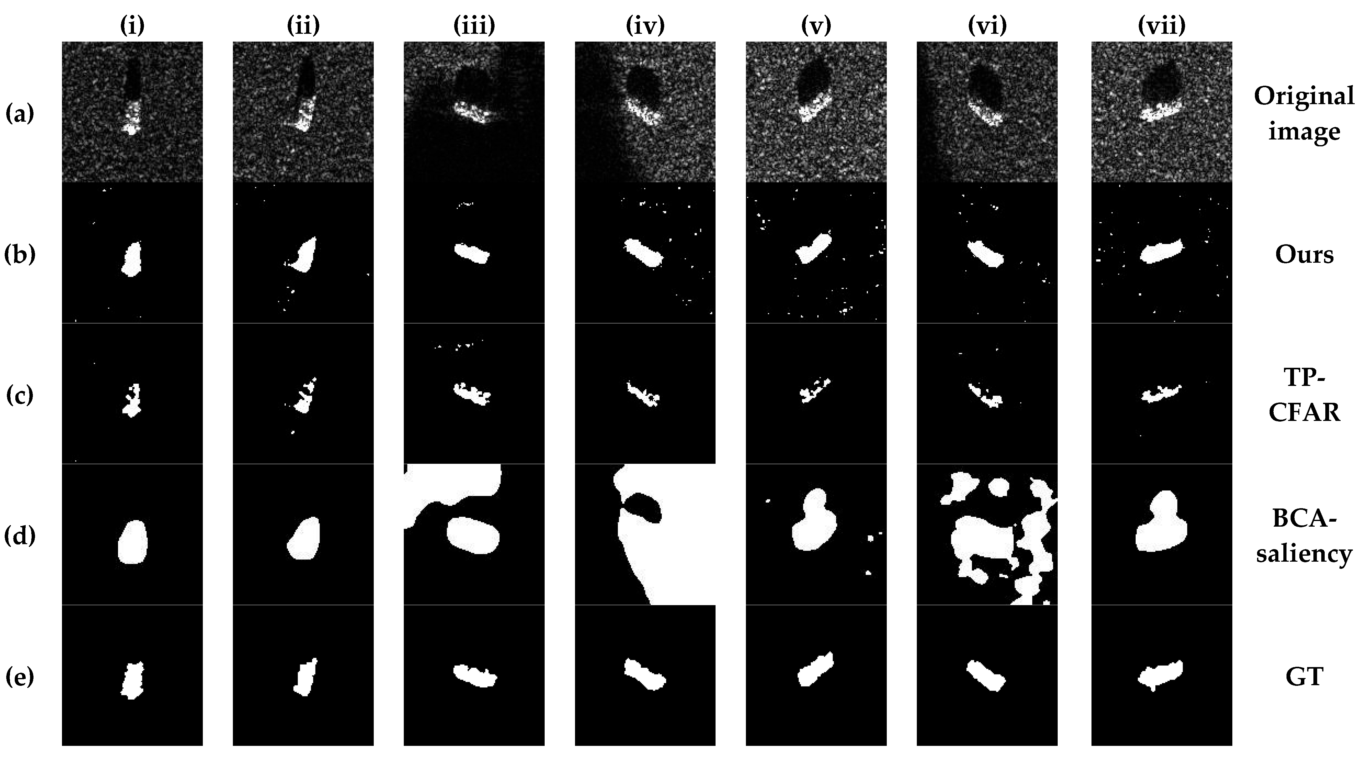 25] did not provide an extraction scheme for BCAsaliency SMs, the OTSU threshold was adopted to segment its SMs for fair comparison with our proposed method. Thus, the actual benchmark method is denoted as BCAsaliency + OTSU, hereafter abbreviated as BCAsaliency. For maritime object detection, TP-CFAR, Density Censoring-CFAR (DC-CFAR) [