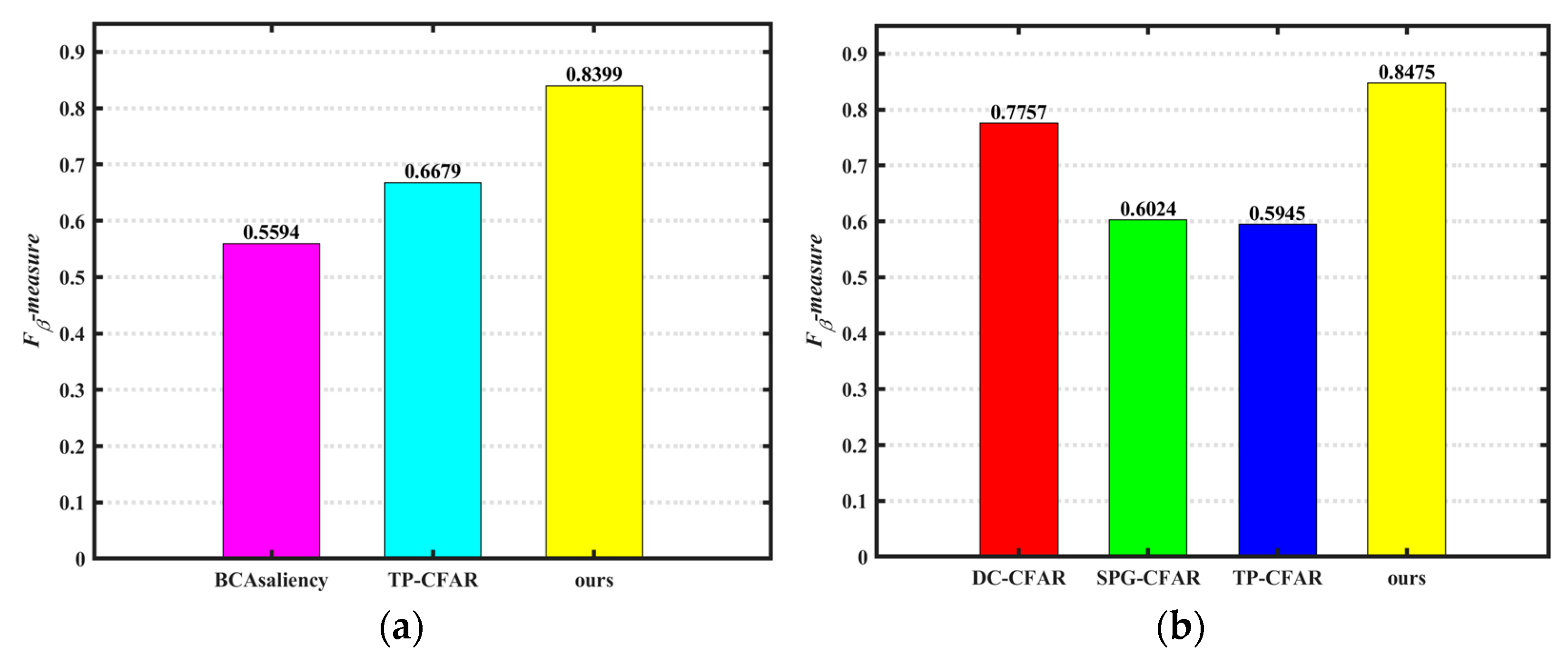 Fβ-measure than those of two classical benchmarks (TP-CFAR and BCAsaliency), demonstrating optimal detection performance. In the maritime scene, although two improved CFAR variants (DC-CFAR and SPG-CFAR) outperform the traditional TP-CFAR, our method still surpasses all three CFAR detectors, yielding the most competitive results.