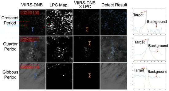 An example of CFAR method verification based on the LPC index during three phases. Blue arrows indicate the transect drawn across the target in the VIIRS-DNB image; orange arrows indicate the corresponding transect in the VIIRS-DNB × LPC image. In the rightmost panels, the digital number (DN) profiles along these transects are plotted using the same color scheme.