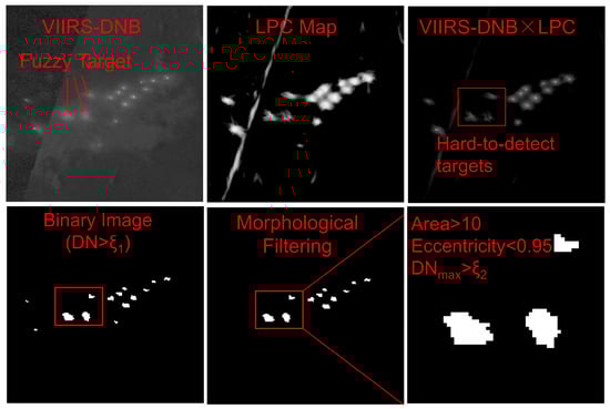 where represents the average DN value of the background unit, denotes the DN value of the target unit, and represents a constant offset at time t. After threshold extraction, local maxima are used to separate candidate targets. Adjacent lit fishing boats are delineated into separate regions to form individual light points.