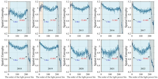 According to the definition of spatial information entropy, lower entropy indicates a more concentrated distribution of fishing boats, while higher entropy suggests a more dispersed pattern. As shown in Figure 5, a sudden drop in entropy is observed for boats with light power < 1.2–3.7 kW, 1.2–3.7 kW to 28.6–43.2 kW, and >28.6–43.2 kW in different years, suggesting that boats in these ranges tend to cluster and are likely of the same type, while boats in different intervals represent different types. Based on Figure 5 and prior knowledge of lit fishing operations in the SCS, the boats are classified into three types: small lighted interfering boats (<1.2–3.7 kW) [34], small-to-medium-sized lit fishing boats (1.2–3.7 kW to 28.6–43.2 kW), and large lit fishing boats (>28.6–43.2 kW) [2]. The thresholds applied in this study reflect light power rather than engine capacity and are derived from spatial entropy analysis. Despite the lack of direct AIS validation, the resulting categories show good alignment with documented light power characteristics of fishing vessels in this region [2].