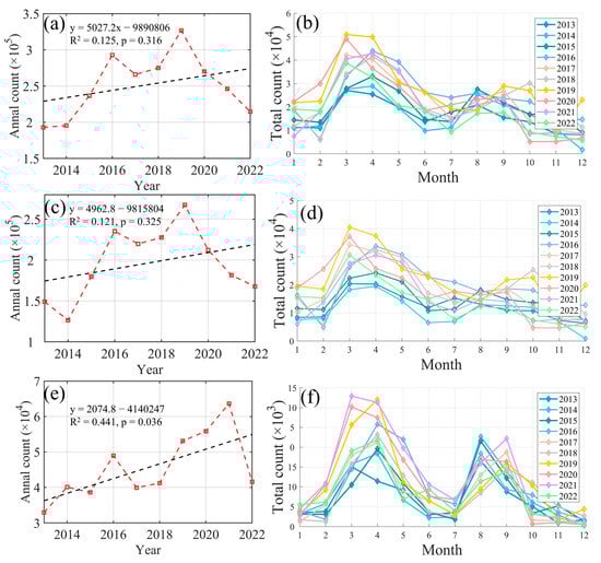 (a) Annually number of lit fishing boats; (b) monthly number of lit fishing boats across different years; (c) annually number of small-to-medium lit fishing boats; (d) monthly number of small-to-medium lit fishing from 2013 to 2022 in the SCS; (e) Annually number of large lit fishing boats; (f) monthly number of large lit fishing boats across different years.