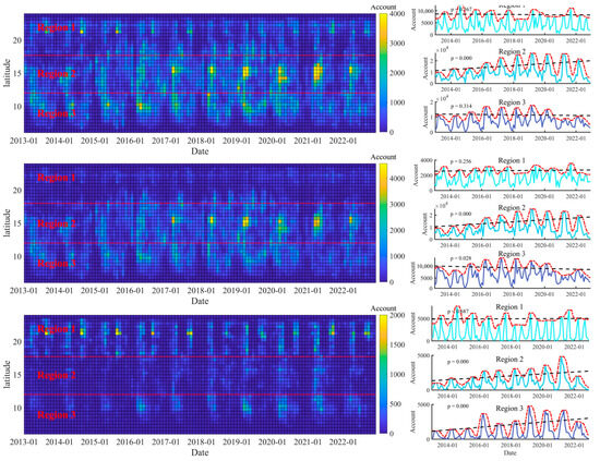 Latitude–time distribution statistics of lit fishing boats (the top row); Latitude–time distribution statistics of small-to-medium lit fishing boats (the second row); Latitude–time distribution statistics of large lit fishing boats (the bottom row). The blue line represents the monthly number of lit fishing operations in the corresponding region, the red line indicates the variations in fishing operations during the peak fishing seasons (March and September each year), and the black dashed line denotes the linear fitting trend.