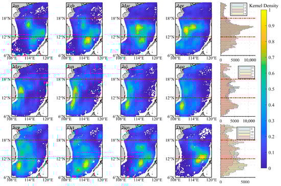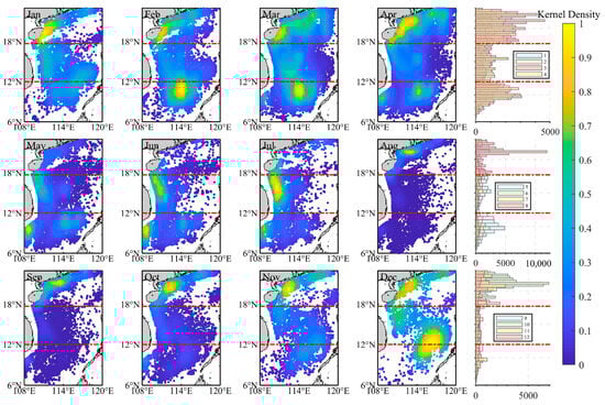 In the SCS, small-to-medium-sized lit fishing boats operate primarily in three regions: the central SCS, southeast near Vietnam, and the Nansha Islands (Figure 8). Their fishing intensity is significantly higher in the central and southern SCS than along Guangdong’s coast, with peak activity during March and April. Throughout the year, fishing hotspots alternate between the central and southern regions, maintaining consistently high fishing intensity due to frequent operations.