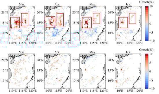 The growth rate of lit fishing boats from March to June (the red box represents two areas with intense growth in fishery activities). (a–d) represent small-to-medium-sized lit fishing boats, while the (e–h) represent large lit fishing boats.