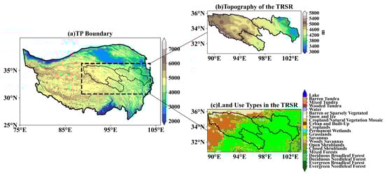 Study area: (a) location of the TRSR within the TP, based on SRTM; (b) topography of the TRSR derived from WRF model data; (c) land use types in the TRSR, obtained from WRF model datasets.