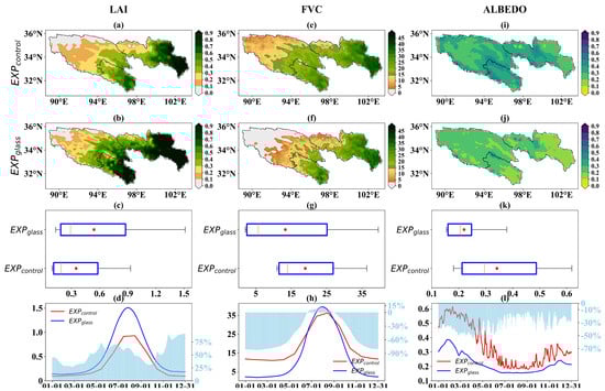 (a) Spatial distribution of LAI in EXPcontrol; (b) spatial distribution of LAI in EXPglass; (c) Boxplot of LAI for EXPcontrol and EXPglass (red dots indicate mean values); (d) daily variation in regional mean LAI, with light blue bars representing the relative difference between EXPglass and EXPcontrol (calculated as (EXPglass − EXPcontrol)/EXPcontrol × 100%). Panels (e–h) present corresponding results for FVC, and panels (i–l) for surface albedo.