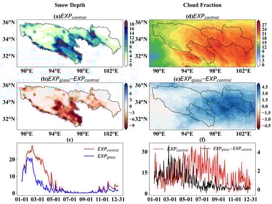(a) Spatial distribution of snow depth in EXPcontrol; (b) difference in snow depth (mm) between EXPglass and EXPcontrol (EXPglass − EXPcontrol); (c) daily variation in regional mean snow depth, with the red line denoting EXPcontrol and the blue line denoting EXPglass; (d) spatial distribution of cloud fraction in EXPcontrol; (e) differences in cloud fraction between EXPglass and EXPcontrol (EXPglass − EXPcontrol); (f) daily variation in regional mean cloud fraction, with the red line denoting EXPcontrol and the black line denoting EXPglass − EXPcontrol.