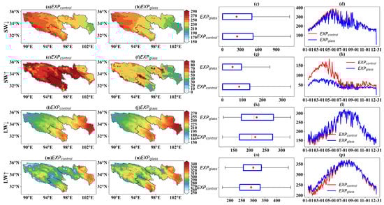 (a,b) Spatial distribution of SW↓ (W·m−2) in EXPcontrol and EXPglass; (c) boxplot of SW↓ for both EXPcontrol and EXPglass (red dots indicate means); (d) daily variation in regional mean SW↓, with the red line representing EXPcontrol and the blue line representing EXPglass. Panels (e–h) present corresponding results for SW↑ (W·m−2). Panels (i–l) for LW↓ (W·m−2), and panels (m–p) for LW↑ (W·m−2).