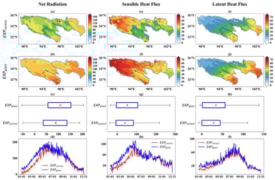 (a,b) Spatial distribution of net radiation (W·m−2) for EXPcontrol and EXPglass, respectively; (c) boxplot of net radiation for both experiments (red dots indicate mean values); (d) daily variation in regional mean net radiation, with the red line representing EXPcontrol and the blue line representing EXPglass. Panels (e–h) present corresponding results for SH (W·m−2), and panels (i–l) for LH (W·m−2).