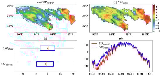 (a,b) Spatial distribution of TSK (°C) for EXPcontrol and EXPglass, respectively; (c) boxplot of TSK for both experiments (red dots indicate mean values); (d) daily variation in regional mean TSK, with the red line representing EXPcontrol and the blue line representing EXPglass.