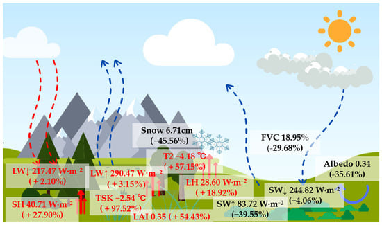 Schematic diagram illustrating variations in the surface energy balance over the TRSR. Albedo—surface albedo; LAI—leaf area index; FVC—fractional vegetation cover; Snow—snow depth (mm); SW↓—downward shortwave radiation (W·m−2); SW↑—upward shortwave radiation (W·m−2); LW↓—downward longwave radiation (W·m−2); LW↑—upward longwave radiation (W·m−2); LH—latent heat flux (W·m−2); SH—sensible heat flux (W·m−2); T2—2 m air temperature (°C); TSK—surface skin temperature (°C). The numbers in the figure represent the value of EXPcontrol, and the percentages represent the percentage change of EXPglass relative to EXPcontrol. Red text: EXPcontrol (relative increase to EXPcontrol); Black text: EXPcontrol (relative reduction to EXPcontrol).