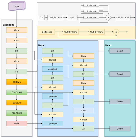 Architecture of the proposed DCS-YOLOv8 network. The network builds upon YOLOv8s by integrating the C2f-DCAM module in the backbone to enhance both local and global feature fusion. The SCDown module performs efficient downsampling while preserving spatial detail. An additional P2 detection layer is introduced to capture high-resolution features, thereby improving small object detection. Arrows indicate the flow of feature maps through the backbone, neck, and multi-scale detection heads. The overall design achieves a balance between lightweight efficiency and enhanced detection performance for small targets.