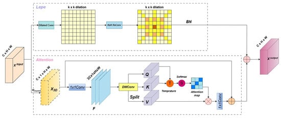 The Lepe branch is built upon the Dilated Reparam Block (DBR) [28], which fuses large-kernel convolutions with parallel small-kernel convolutions employing various dilation rates. This design enables the module to capture both fine-grained local structures and broader spatial patterns efficiently. During training, the outputs from different branches are combined to enhance multi-scale representation. After training, these branches are consolidated into a single equivalent convolution via reparameterization, thus reducing inference complexity without sacrificing performance. By taking the input feature graph () and leveraging the convolution reparameterization block, we enhance the local multiscale features, as depicted in Equation (1):