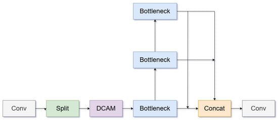 Structure of the C2f-DCAM module. This module combines the original C2f block from YOLOv8 with the DCAM module, retaining the multi-branch residual connections and gradient propagation advantages of C2f while further enhancing the fusion of local and global features. C2f-DCAM enables richer spatial representations and sharper boundary delineation for small objects in cluttered UAV imagery.
