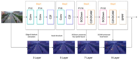 Overall architecture of DCS-Net with heatmap visualization. The network processes 640 × 640 input images through four stages, each extracting and refining features. Heatmaps illustrate spatial attention changes: Stage 1 focuses on low-level features, such as edges and textures; Stage 2 highlights small-object regions; Stage 3, enhanced by C2f-DCAM, combines local and global features to emphasize targets in complex backgrounds; Stage 4 uses SCDown for efficient downsampling while retaining critical spatial structures. The results confirm the complementary roles of each module in enhancing small-object perception.