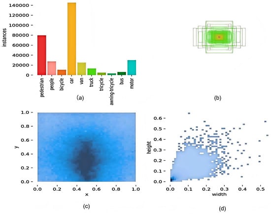 DCS-YOLOv8 underwent assessment using the VisDrone 2019 dataset, offering a diverse and comprehensive sample collection. The dataset’s image distribution, label count, and object size variability are depicted in Figure 5, illustrating various inherent complexities. Target detection faces challenges due to factors like dense clustering, motion blurring, diminutive target dimensions, and class indistinctness. For instance, distinguishing between branches and individuals can be arduous in certain scenarios. Moreover, aerial imagery from UAVs introduces notable variations in object sizes and increased occlusions, further complicating detection tasks. The dataset exhibits class imbalance, notably with the Car category comprising 144,867 annotations, while the Awning-tricycle category only has 3246. This imbalance necessitates a robust detection model capable of effectively handling underrepresented classes. Additionally, the distribution of anchor sizes reveals that although medium and large anchors predominate in categories like trucks, cars, and buses, the majority of objects are smaller than 100 × 100 pixels, with a significant portion even smaller than 50 × 50 pixels, presenting additional challenges for detecting small objects.