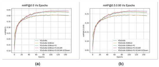 (a,b) show the training epochs of DCS-YOLOv8’s and . The model performance was improved by gradually introducing improvement modules (SDB-IoU, P2 layer, DCAM, SCDown), and the final version performed best on and .
