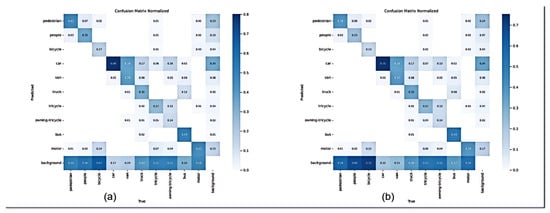 Nevertheless, some challenges remain. Categories such as ‘Bicycle’ (17.2%), ‘Tricycle’ (33.3%), and ‘A-tricycle’ (18.1%) continue to exhibit notable confusion, frequently misidentified either among themselves or as background. This is likely due to similar visual structures and dense scene contexts. Even so, the overall improvement across most categories highlights DCS-YOLOv8’s superior feature discrimination and contextual reasoning capabilities.
