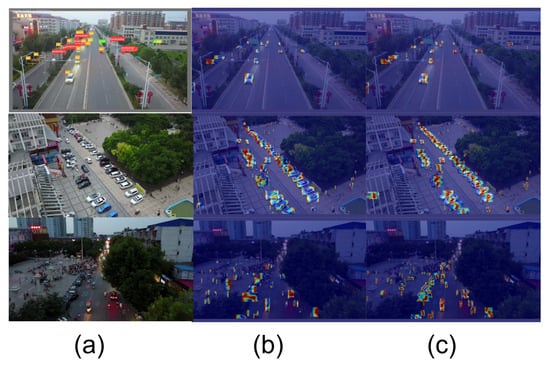 Feature activation maps generated by (a) the baseline model, (b) YOLOv8s, and (c) the proposed DCS-YOLOv8 under complex UAV scenarios, including dense occlusion, background clutter, and low illumination. Compared to (a) and (b), DCS-YOLOv8 exhibits more concentrated and context-aware attention, enabling more accurate identification of small and obscured objects.