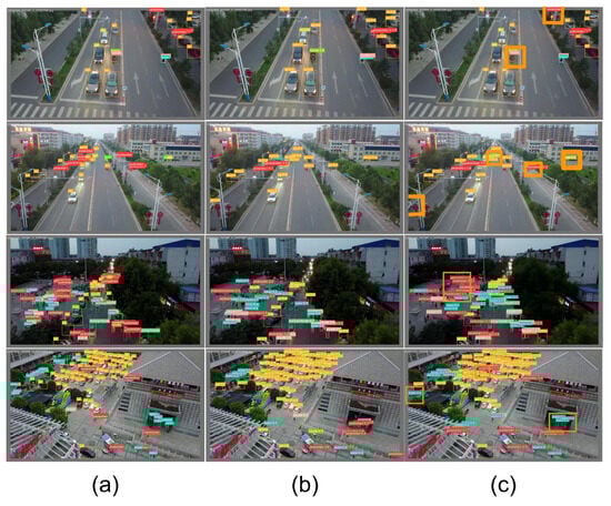 Detection results produced by (a) the baseline model, (b) YOLOv8s, and (c) DCS-YOLOv8 across various real-world aerial scenarios, such as high-altitude views, occluded urban scenes, and low-light environments. DCS-YOLOv8 outperforms the other models in detecting small, overlapping, and visually ambiguous objects, while maintaining better localization accuracy and fewer false positives.