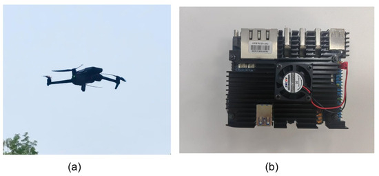 Hardware setup of the real-time UAV detection system integrating DCS-YOLOv8. (a) for DJI Mavic 3 drone, (b) for Orange Pi RK3588 hardware.