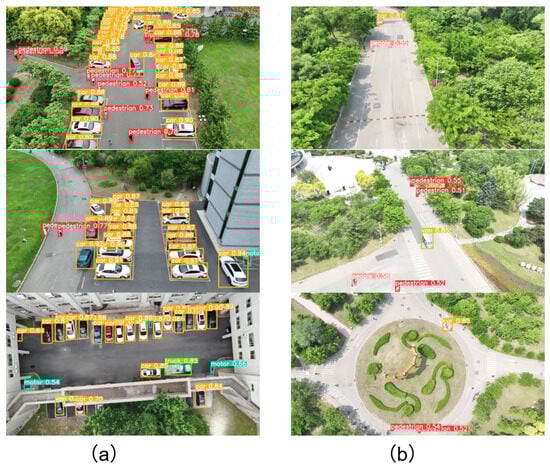 Detection results of DCS-YOLOv8 under different UAV flight altitudes. (a) contains dense, large-scale targets such as vehicles; (b) shows sparse, small-scale targets like pedestrians and riders. Large objects are detected reliably across altitudes, while small object detection benefits from lower-altitude imaging.