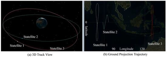 Three-dimensional spatial distribution of satellite orbital scenario and ground-projected trajectories. (a) A three-dimensional orbital view illustrates the elliptical orbital distributions of three satellites within the Earth’s gravitational field, with Satellites 1, 2, and 3 operating on distinct orbital planes to form a configuration with varying inclinations and eccentricities. (b) The associated ground-projected trajectories highlight the geometric projection patterns of each satellite’s path onto the Earth’s surface.