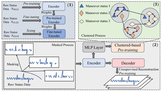 In component (1), we first pre-train the encoder using the original, extensive state data from different simulation scenes, resulting in a pre-trained encoder with fixed weight parameters. Subsequently, we fine-tune the pre-trained encoder using the test scenario data corresponding to the satellite’s location, updating the encoder’s weight parameters. Finally, we evaluate the fine-tuned encoder’s performance on the test set for geosynchronous satellite state detection. For component (2), we apply multiple random masking operations to the original state sequence data, generating a time- and frequency-domain time series that contains missing values. This masked sequence is then fed into the encoder to obtain a feature representation of the corresponding samples. These feature representations are subsequently input into a decoder, specifying the model for unsupervised reconstruction pre-training using the real observations from the original complete sequence data. In component (3), the feature representation obtained from the encoder is passed through a multi-layer perception layer for clustering-based pre-training, based on the process outlined in (2). Specifically, we use the categories of motorized behaviors in the original sequence state data as the number of clusters for the clustering task, and perform unsupervised clustering pre-training using the designed clustering loss function.
