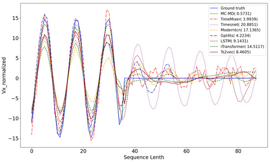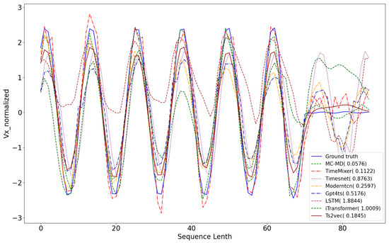 Figure 7 and Figure 8 present reconstruction results on simulated and real-world test sequences, respectively. In the simulated case, the anomaly occurs at time step 36; in the real-world case, it appears at step 69. In both scenarios, the blue solid line denotes the ground truth trajectory, which all baseline models aim to reconstruct. The sequences exhibit periodic behavior with distinct deviations at the maneuver points. Our proposed MC-MD method yields reconstructions that most closely follow the ground truth, effectively capturing both the underlying periodic structure and the abrupt deviations associated with maneuvers. It achieves the lowest Mean Squared Error (MSE) among all models, highlighting its superior reconstruction accuracy. TimeMixer also demonstrates reasonable performance by capturing general periodic trends. However, it deviates near anomaly points, indicating limited sensitivity to sharp transitions. Other baseline methods perform noticeably worse, with significant reconstruction errors—particularly around anomalous segments—suggesting insufficient capacity to model the complex temporal dynamics of satellite maneuvers. These results confirm the advantage of MC-MD in reconstructing high-fidelity sequences, particularly in scenarios involving both smooth orbital trends and sudden behavioral shifts, which are critical for accurate maneuver detection.