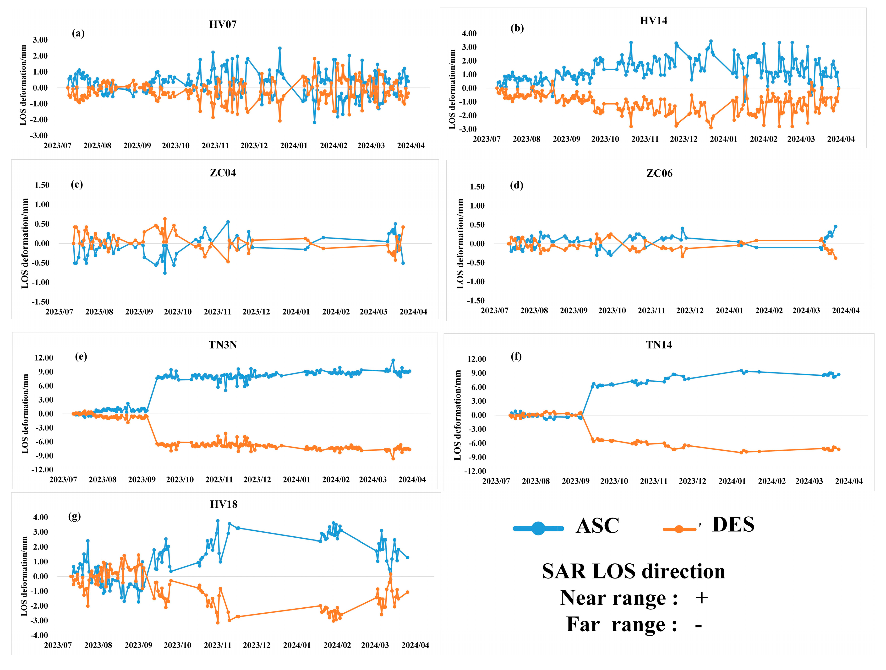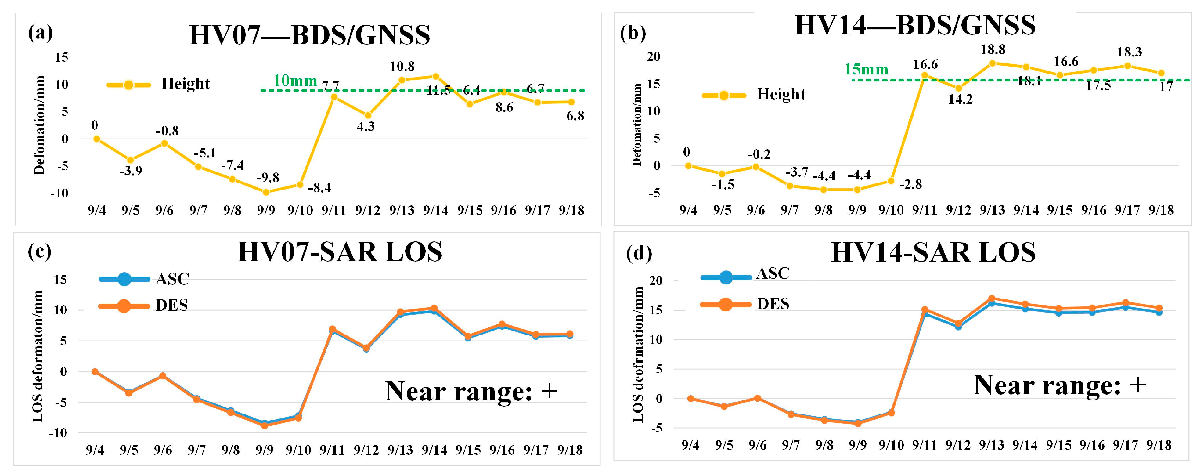 3.2.3. BDS/GNSS-Monitored Man-Made Vertical Deformation and LOS Projection