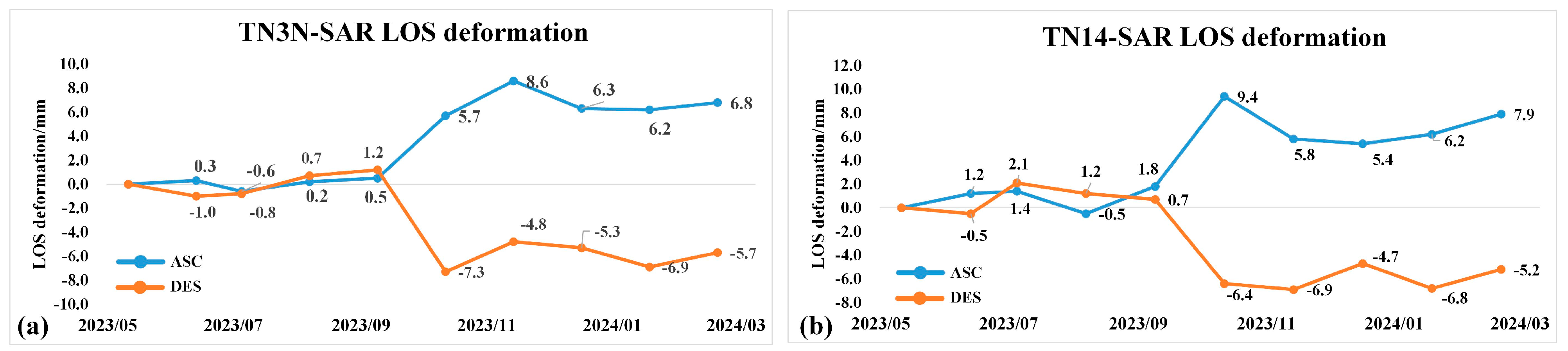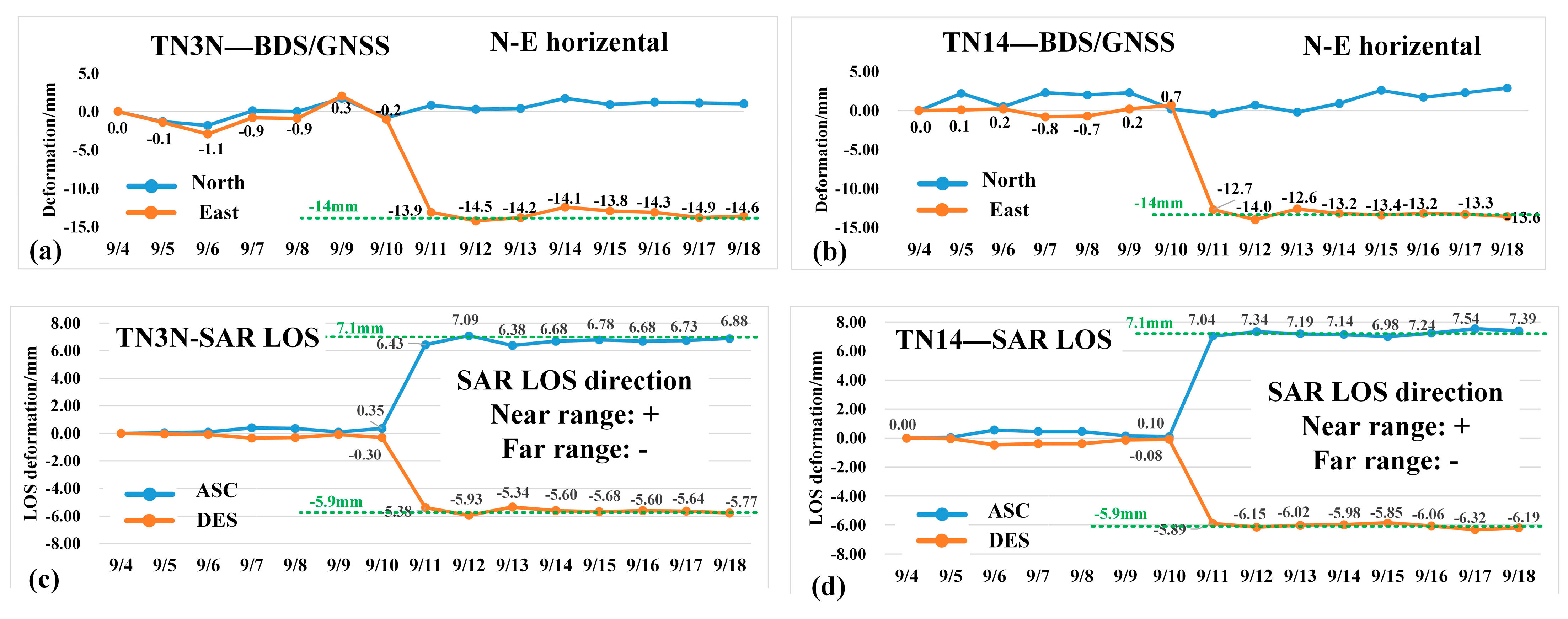 3.2.2. BDS/GNSS-Monitored Man-Made Horizontal Deformation and LOS Projection