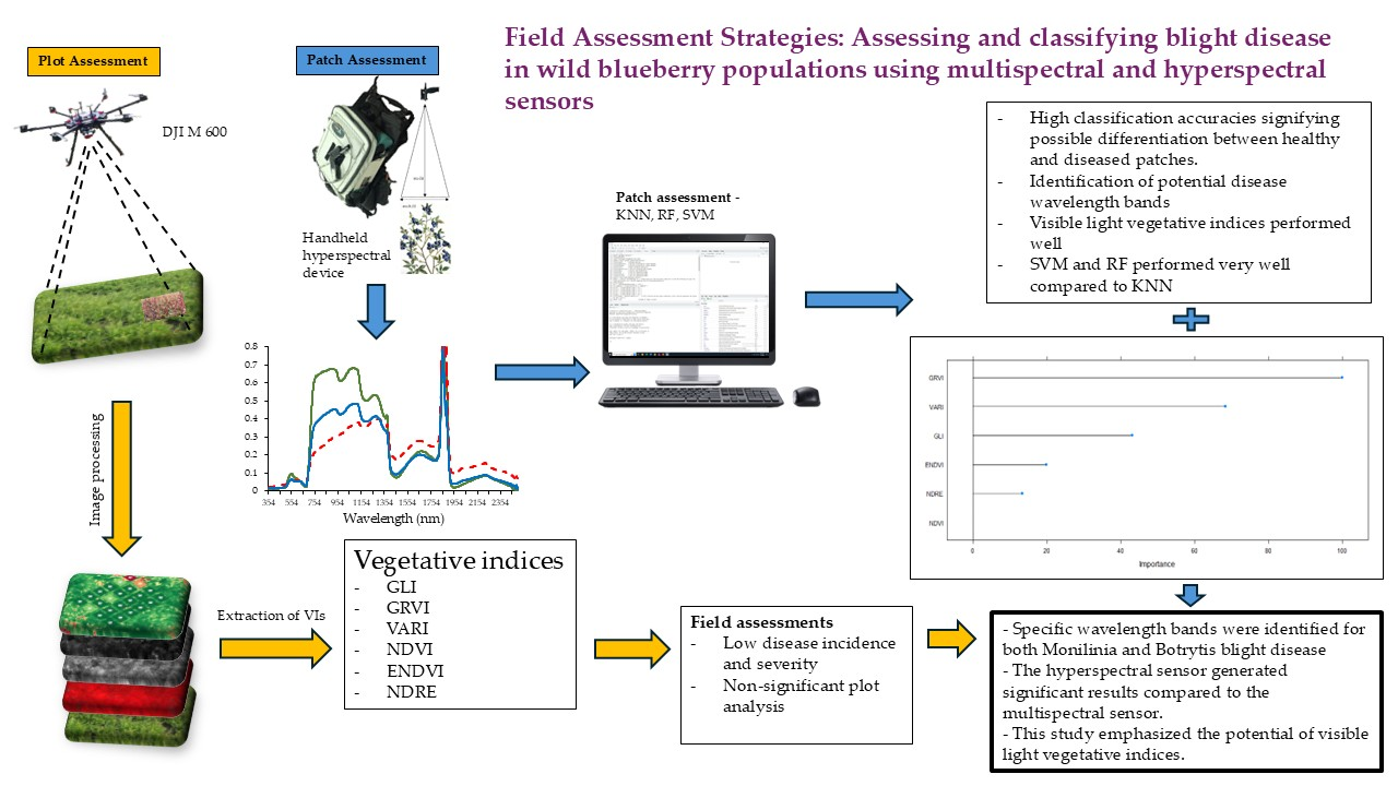 Notwithstanding the successes observed, the study presents an initial assessment of the UAV multispectral and handheld hyperspectral sensing for disease detection in wild blueberry fields. These significant challenges affect its broader applicability, including scalability of technology, limited disease pressure and sampling diversity, restricted data contamination control, and phenological timing, which affects real-world scenarios. Furthermore, limited use of multispectral data and algorithm complexity, and lack of time-series analysis to allow for monitoring and predictability, affected the overall success of the study. While these limitations constrain immediate large-scale adoption, the findings demonstrate the potential of remote sensing for disease monitoring and highlight areas for future research, particularly regarding automation, advanced analytics, and scalable workflows. To address these challenges, future research should focus on automation, advanced analytics, and scalable workflows. Thus, more practical approaches can be adopted, like integrating hyperspectral sensors on UAVs or ground-based platforms to achieve high throughput or using high-capacity UAVs for extended coverage.