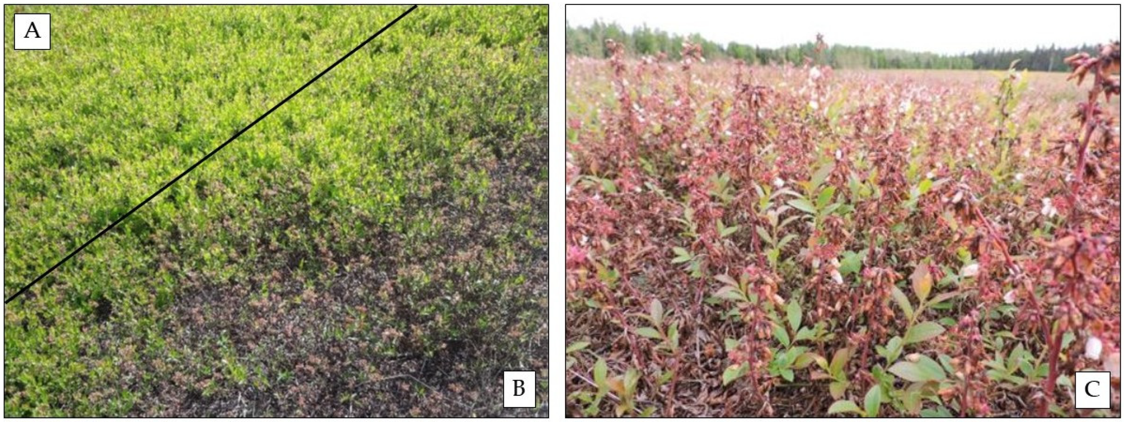 Effective aerial detection of MB and BB using remote sensing remains challenging in wild blueberries unless widespread symptoms are present across large plant patches. This is largely because symptoms of these diseases, such as the dark brown lesions or dense grey discoloration, affect the plant’s physiology in subtle ways that are not easily detected from above [