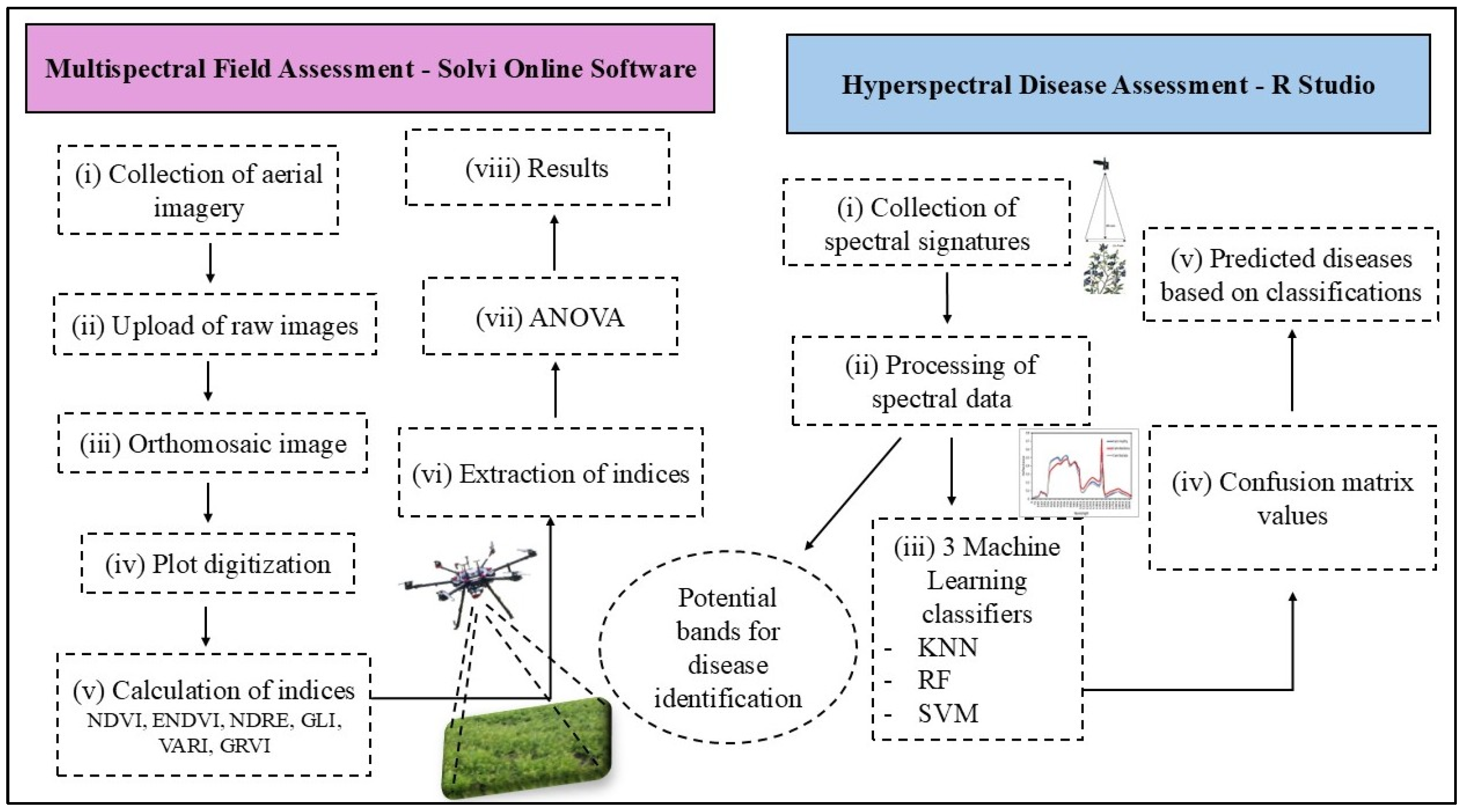 32]. The levels of accuracy displayed in this study have shown the potential of using these classifiers in estimating diseases. The significance of the two techniques cannot be underplayed, but results point to the use of the hyperspectral spectroradiometer as a superior sensor over the micasense. Therefore, whereas a spectrum list of VIs can be generated using the hyperspectral device, the multispectral sensor limits the number of VIs [