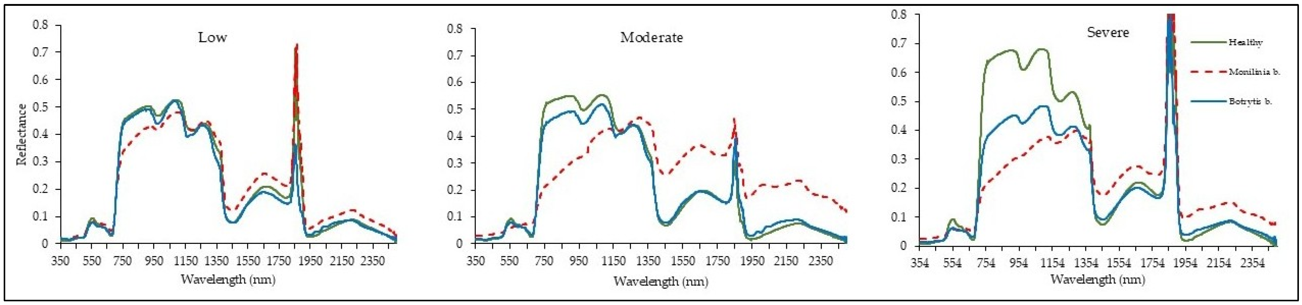 4.2. Patch Assessment of Monilinia and Botrytis Blight Disease Using the Hyperspectral Radiometer