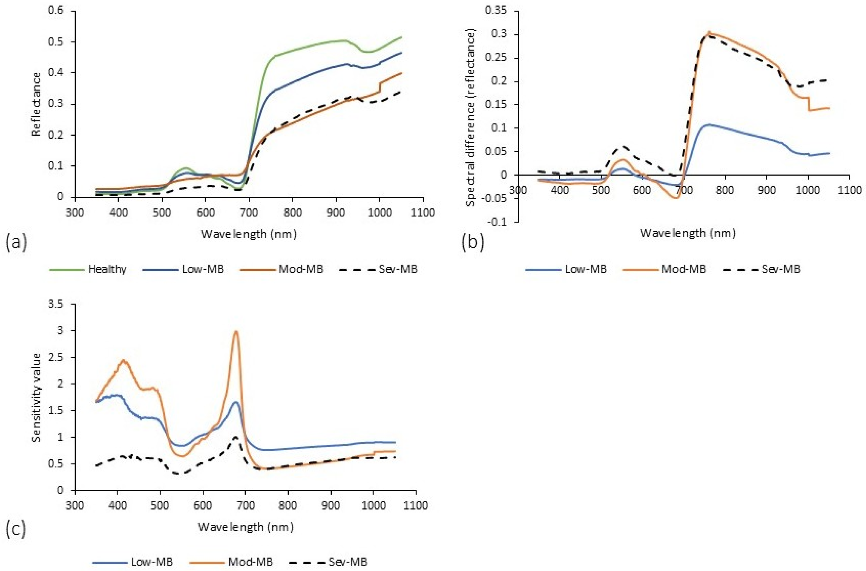 7], which are a fraction of the total plant area; thus, the effect of the disease is overshadowed by the canopy effect. However, the other consideration was to focus on the related biochemical and biophysical portions of the spectrum. Despite these developments, the reflectance from these plants compared to a healthy plant looked similar, with very slight differences. This is because the gross effect of the affected floral tissue compared to foliage may be insignificant, thus accounting for the similarity between spectral readings of healthy and BB disease. Unlike MB, which affects plant foliage, this should command a significant spectral difference when compared to the healthy treatment. These results have indicated that the VIS and NIR regions contribute significantly to the identification of disease severity. In this study, 8 wavelength bands, 415, 484, 554, 555, 680, 681, 745, and 761 nm, have been shown to be sensitive in the determination of MB disease, whereas 3 bands, 457, 665, and 694 nm, were sensitive to BB disease. The identification and detection of