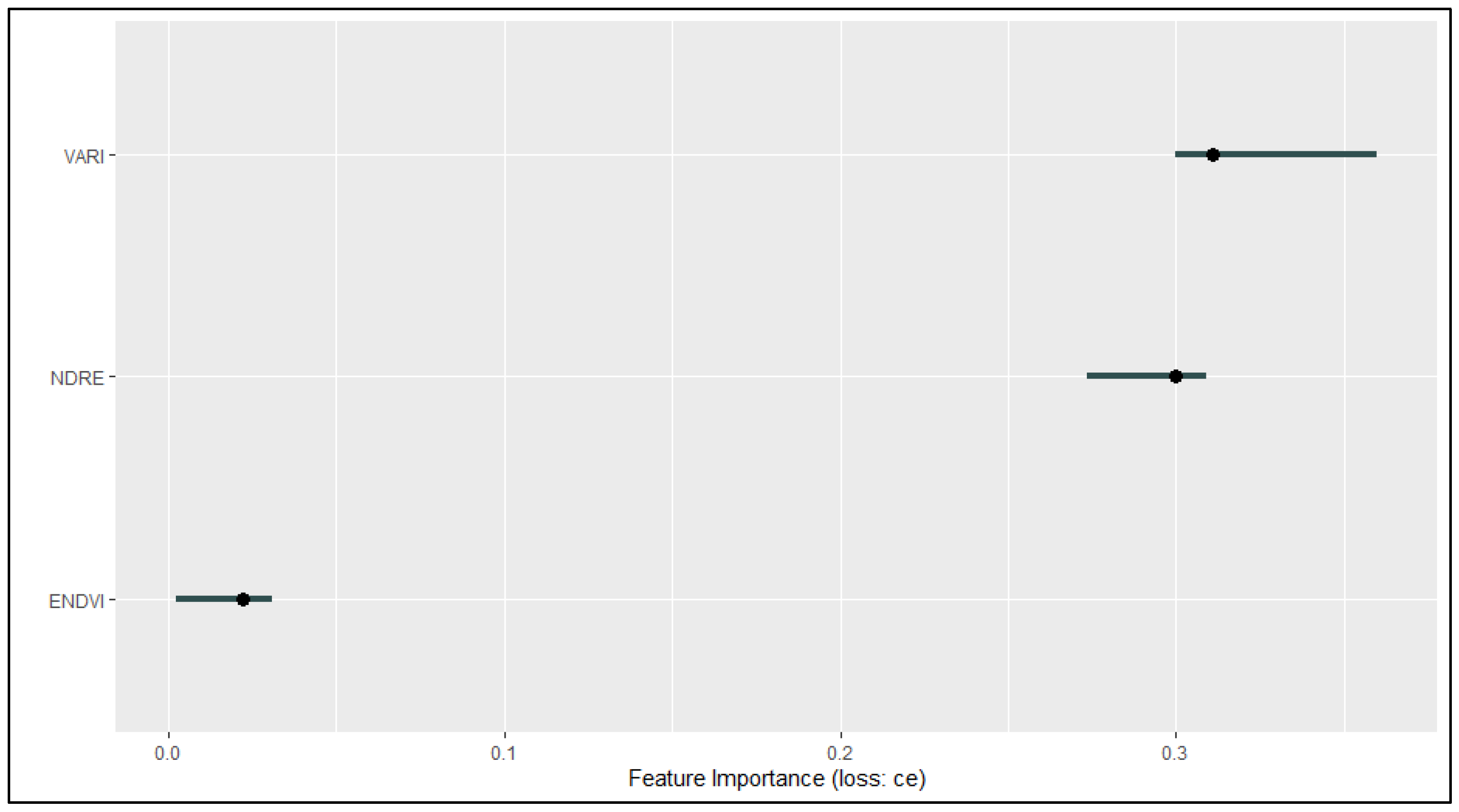 3]. Further confirmation is derived from the variable importance plots, which also put VARI ahead of the near-infrared VIs. Since high correlation exists between VARI, GLI, and GRVI, it can therefore be assumed that these VIs have a great impact in discriminating diseases.