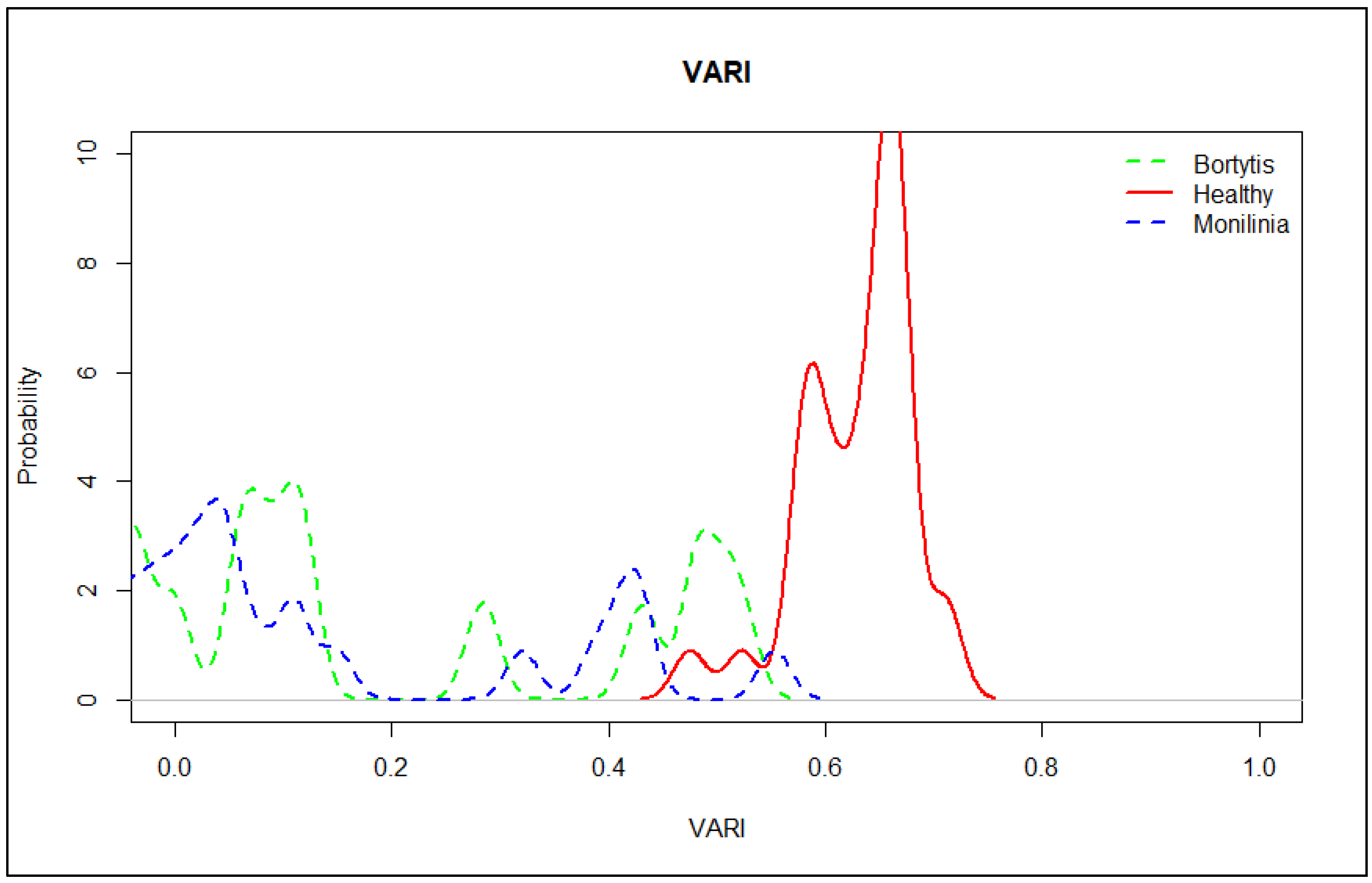 Despite the success in using other VIs, results highlighted the ability of VARI, GLI, and GRVI in discriminating healthy plants from diseased plants with minimal overlap. Therefore, the probability graph has shown the discriminating abilities of the different VIs (