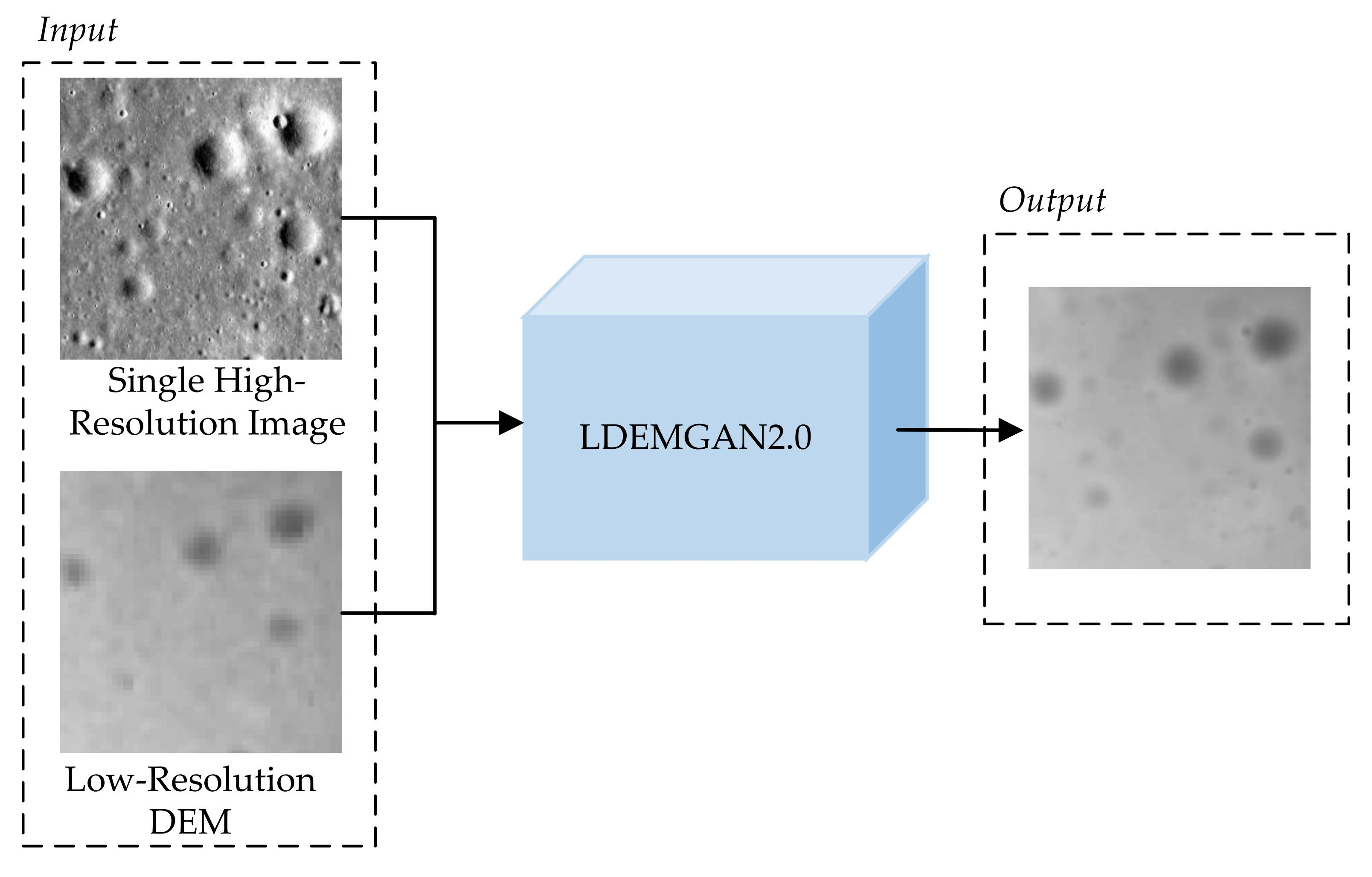 - Liu, Y.; Wang, Y.X.; Di, K.C.; Peng, M.; Wan, W.H.; Liu, Z.Q. A Generative Adversarial Network for Pixel-Scale Lunar DEM Generation from High-Resolution Monocular Imagery and Low-Resolution DEM. Remote Sens. 2022, 14, 5420. [Google Scholar] [CrossRef]
