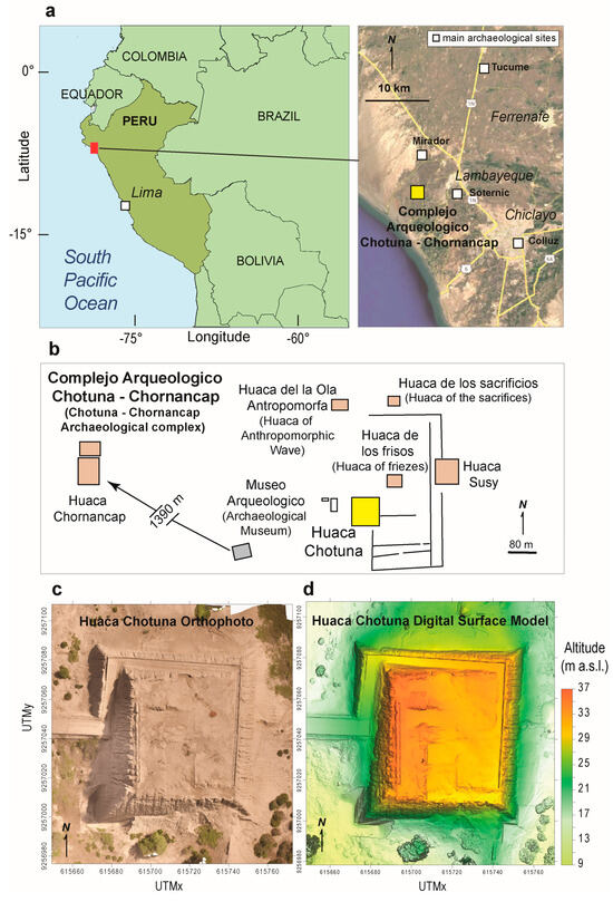 (a) Location map of the Complejo Arqueologico Chotuna-Chornancap and huacas of the Lambayeque region. Names of cities are reported italic character. (b) Map of the Complejo Arqueologico Chotuna-Chornancap with location of the Huaca Chotuna (yellow). (c) Orthophoto of the Huaca Chotuna; (d) digital surface model (DSM) of the Huaca Chotuna.