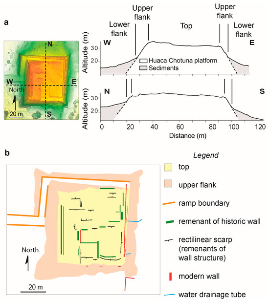 Erosion due to rainfall and wind represents a key environmental process affecting the Earth’s surface. Effects of erosion include changes in the properties and distribution of soils, groundwater recharge/discharge cycles, stream network geometry, and damage to the infrastructures of urban, transportation and agricultural areas, and to cultural heritage [1,2,3]. Among the different factors controlling the intensity of erosion processes, the increasing amount of rainfall intensity and strong winds related to climate change play a major role [4,5], being that rainfall intensity is proportional to erosion rate [6,7]. In such a perspective, erosion poses a serious threat to cultural heritage [8,9,10]. Water and winds are cause of the loss of structural integrity of the pre-Hispanic settlements, especially those affected by potentially dangerous climatic phenomena as the El Niño Southern Oscillation (ENSO) events [11,12]. Therefore, the conservation of such sites needs a clear understanding of the erosion processes and their relations with climate [13,14]. Defending cultural heritage requires an interdisciplinary approach including monitoring and hazard evaluation in the framework of climate adaptation plans, conservation actions, and sustainable land use [15,16,17,18]. However, the first step in the evaluation of the preservation strategies is the recognition of the connections between erosion processes and induced degradation. About 10% of the world’s heritage consists of earthen sites often affected by erosion due to intense rainfall, wind, and sediment-laden wind [19,20]. Archaeological sites located along the northern coast of Peru in the Lambayeque region mainly consist of platforms (huacas, from the Quechuan wak’a) made up of adobe (clay–silt–straw bricks). These peculiar ceremonial buildings date from the 2nd Millenium BC to the 16th Century AD [21,22,23]. The Complejo Arqueológico Chotuna-Chornancap (Chotuna-Chornancap Archaeological Complex; Figure 1a,b) is an important ceremonial center including truncated pyramid-shaped structures developed in the Lambayeque valley from the 6th to 7th Century AD until the time of the annexation by the Tawantinsuyu (Inca Empire) in the 5th Century AD. The main huacas of the Lambayeque coastal area also include Tucume, Mirador, Colluz, and Soternic (Figure 1a,b). This area is characterized by a semi-arid climate, and the bedrock on which the huacas are located consists of lacustrine, alluvial, and aeolian deposits (dunes) [24]. Between May and January–February, the Lambayeque region is affected by south-directed winds related to the Humboldt current [25], whereas west-directed winds related to the ENSO events concentrate between February and April. The timing of El Niño can be roughly predicted but the associated rain and wind intensity remains difficult to forecast [26]. The frequency of the extreme ENSO is expected to increase in the future due to climate change [27]. Destructive ENSO events were recorded in sediments [28], and their impact on the northern coast of Peru date back to thousands of years ago [23,29]. In historical times, Ortloff and Kolata [30] showed that ancient irrigation systems and settlements in Lambayeque were repeatedly eroded, and the local communities rebuilt the infrastructure multiple times or relocated settlements [31].