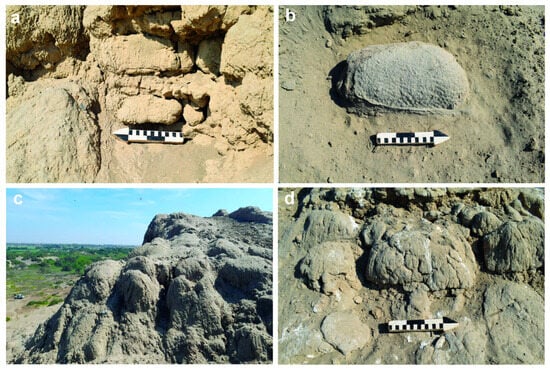 The steeper upper flanks, which represent the original HC flanks, consist of clay-rich adobe bricks covered by massive, unstructured clay-rich sediments. The top of the HC is nearly flat and characterized by remnants of walls and scarps delimiting original enclosure structures (Figure 2b). Modern walls are also present. These have been constructed to regiment the water flow during rain episodes. The access ramp has been reconstructed in recent times, and, at the present, it is laterally delimited by two cm-high rows of bricks. Figure 3 shows that the core of the HC is made up of relatively preserved, loaf- to tall loaf-shaped bricks (Figure 3a,b). The few bricks outcropping on the HC upper flanks are heavily deteriorated and partially dismantled (Figure 3c,d). In addition, they are often covered by a clay-rich patina (Figure 3c) derived from the melting/dissolution of the underlying bricks. Some bricks show mm-sized nearly parallel to anatomizing incisions reflecting the action of water and dehydration cracks associated with thermal stress due to the semi-arid climate of the area (Figure 3d).