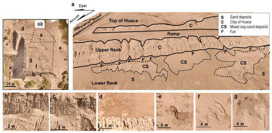 The results of the field and photogrammetric also evidence larger-scale structures related to deposition or erosion phenomena (Figure 4). The upper flanks of the HC consist of clay-rich deposits derived from the dismantling of the underlying adobes and are affected by parallel incisions (gullies) evidencing erosion by water (Figure 4a). The spacing among the incisions is in the order of dm-m. The HC lower flanks consist of loose, massive sands and mixed clay–sand sediments possibly reflecting mixing between the clay from the dismantled bricks and the sands forming the substratum on which the HC has been constructed. At the mouth of the main incisions, fan-like structures and sedimentary wedges (Figure 4a,b) may occur. Some wedges are partially collapsed as testified by slide scars (Figure 4c). Roughly N-S striking ripples due to the wind action outcrop at the base of the northward- and southward-dipping lower flanks of the HC (Figure 4d). The undulation of such ripples, which consist of sand, shows a slight, east-verging asymmetry. At the base of the western flank, we also recognize a 1.5 m deep channel with an east-verging head (Figure 4e). The field survey and orthophotos show that the water discharged from a drainage tube is responsible for the formation of this channel. The top of the HC is also affected by erosive structures. These include up to 8 m long converging incisions (Figure 4f) and two elongated depressions covering an area of 16 m2. Such depressions do not exceed 1 m in depth. They are partially filled with sand and may host a few shrubs, the only variety of vegetation on the HC (Figure 4g).