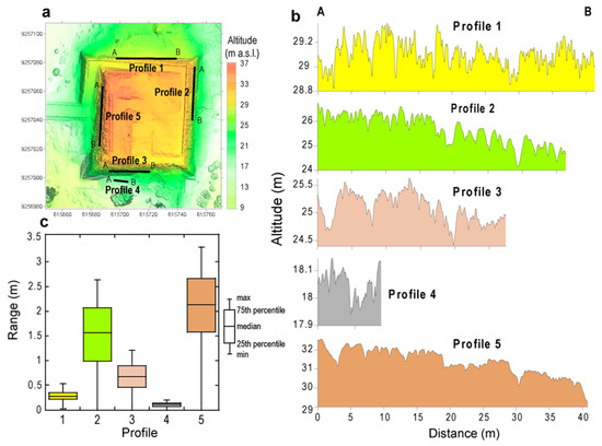 (a) DSM of the Huaca Chotuna with location of the morphological profiles reported in (b). (b) Morphological profiles along the flanks of the Huaca Chotuna. Box plot of the range values determined from each morphological profile reported in (c). Range is the difference between the altitude values along a profile and the minimum value of the profile.