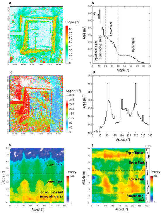 (a) Slope map of the Huaca Chotuna obtained from the DSM. (b) Histogram of the distribution of the slope values. (c) Aspect map of the Huaca Chotuna obtained from the DSM. (d) Histogram of the distribution of the aspect values. (e) Density plot of the aspect vs. slope values from the DSM. (f) Density plot of the aspect vs. altitude values from the DSM.