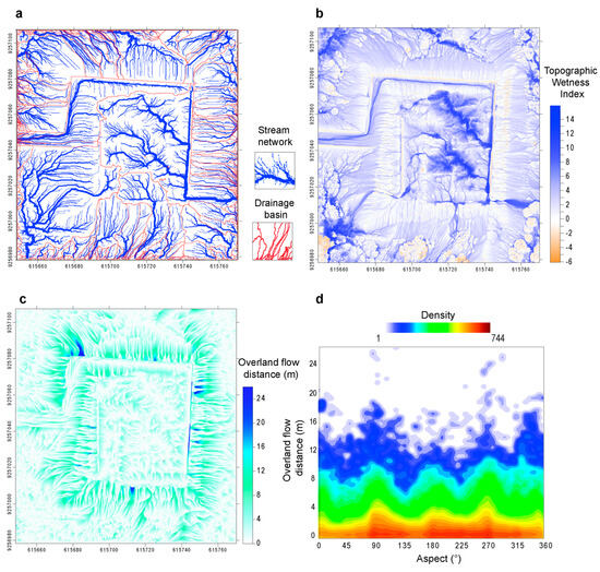 (a) Stream network and drainage basins map of the Huaca Chotuna obtained from the DSM. Stream thickness proportional to the Strahler-order (b) TWI map of Huaca Chotuna. (c) Overland flow distance map of the Huaca Chotuna. (d) Density plot of the aspect vs. overland flow distance obtained from the maps in Figure 6c and Figure 7a.