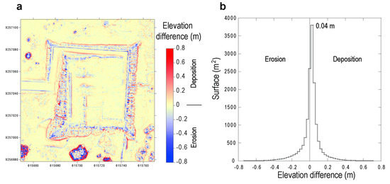 Figure 9a,b reports the HC areas where erosion or deposition from diffusive processes are likely to occur in the next century. Independently from the calculated elevation difference, which may be dependent on the selected value of the diffusion coefficient (see Equation (6)), the areas of erosion or deposition are well-defined. The base of the HC flanks and the incisions associated with gully erosion are sites where deposition is expected to occur. Erosion concentrates on the present-day topographically elevated elements such as the modern walls and remnants of the ancient walls at the HC top.