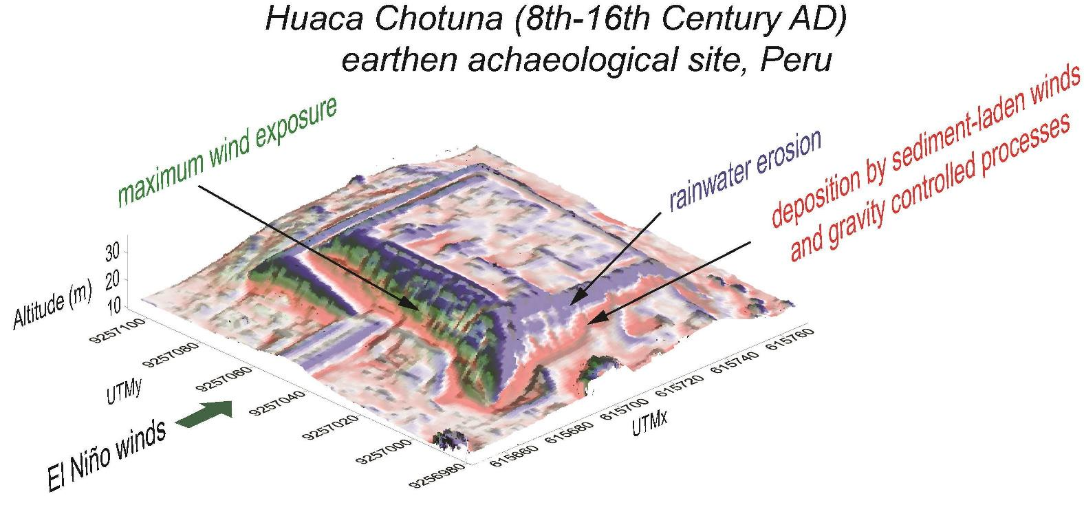 Effects of Rain and Sediment-Laden Winds on Earthen Archaeological Sites from Morphometry: A Case Study from Huaca Chotuna (8th–16th Century AD), Lambayeque, Peru