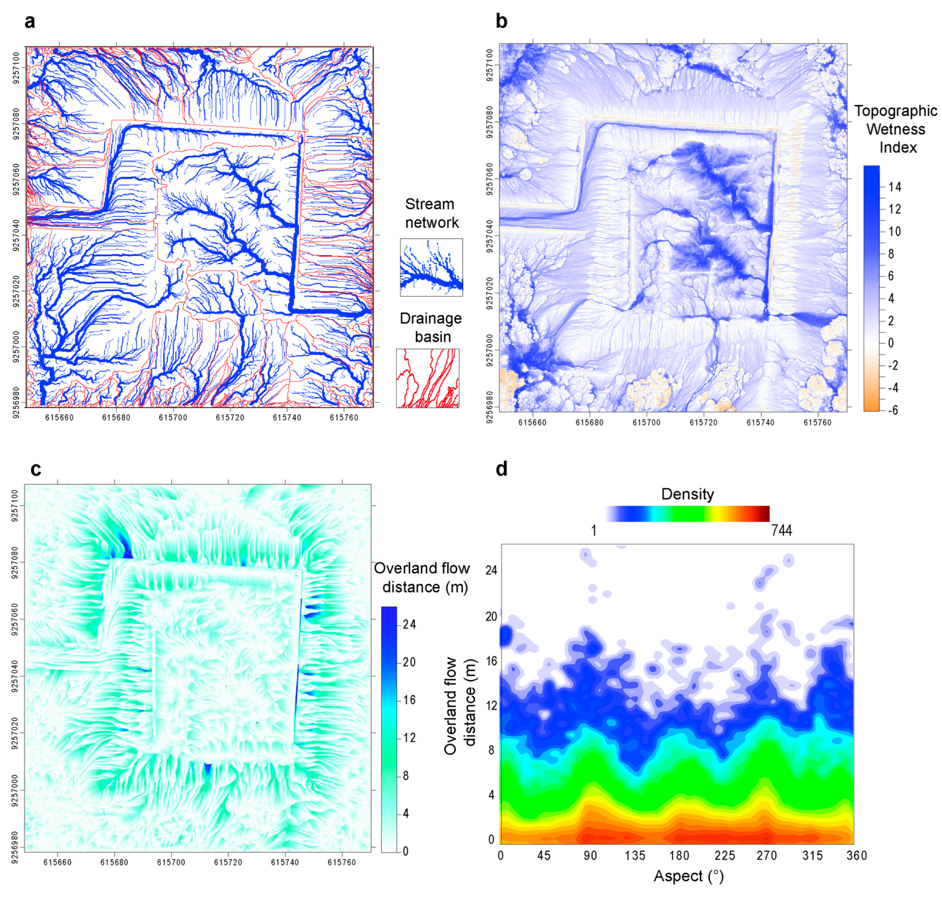 - Stream network and watershed basins have been determined following [57] as implemented in [58]. The Strahler order of the stream network, i.e., the hierarchy of streams, has been calculated with the MATLAB R2024a routine Strahler Stream by Wolfgang Schwangharta available online at https://www.mathworks.com/matlabcentral/fileexchange/22952-strahler-stream-order (accessed on 15 May 2025).